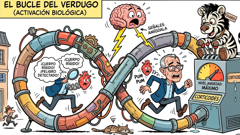 Esta mezcla produce una hiperactivación cortical y autonómica que es el caldo de cultivo perfecto para la ansiedad condicionada. Eres, básicamente, un sistema eléctrico con los cables pelados.